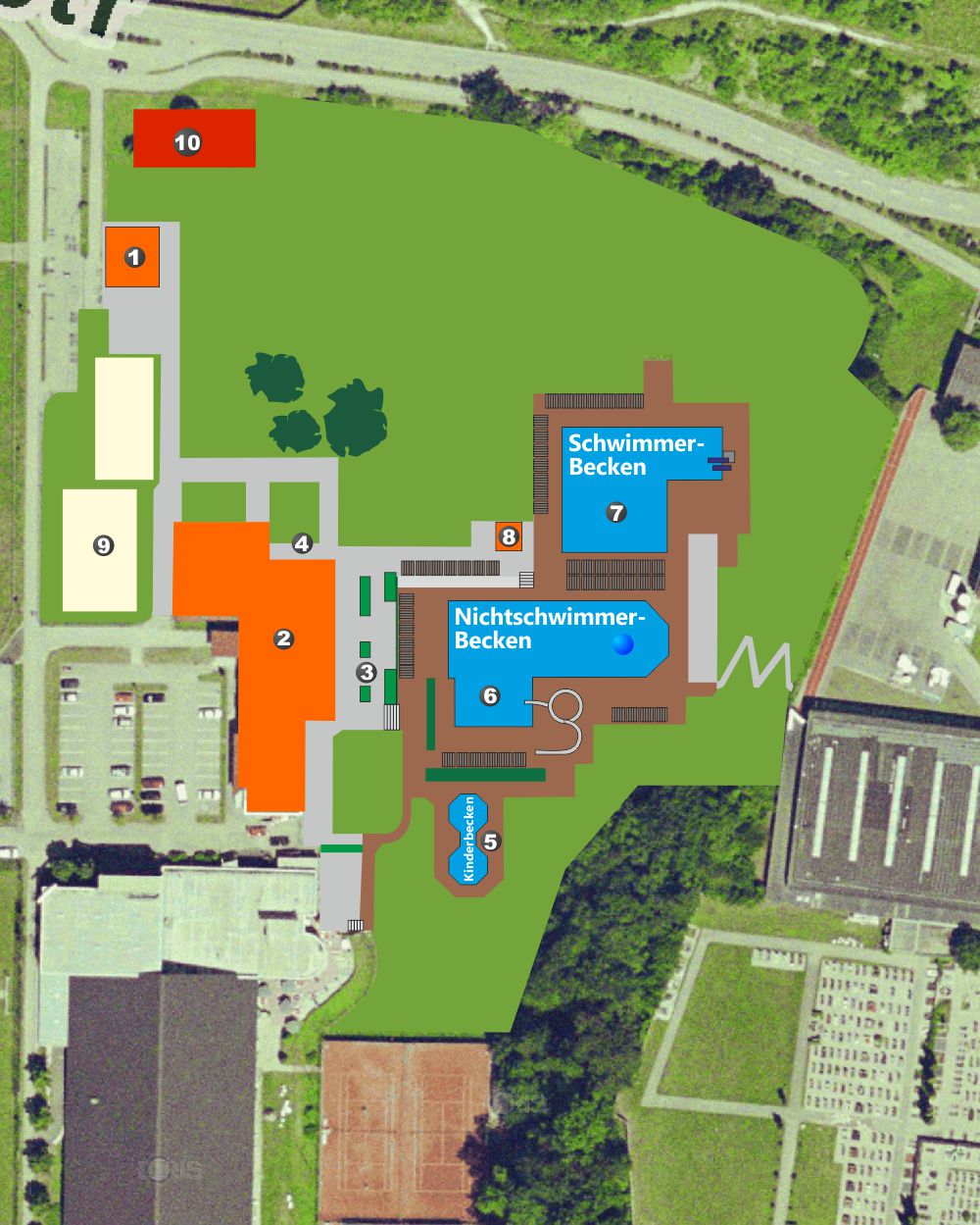 - Hauptgebäude mit Buffet, Umkleidemöglichkeiten, Kabinen, Sanitäranlagen, Wärmeraum